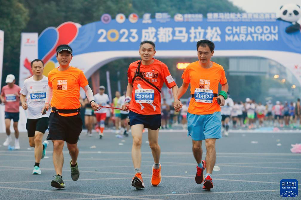 “黑暗跑團”陪跑志愿者覃銳(前左)、曾萬軍(前右)陪伴視障跑者李中書參加2023成都馬拉松比賽(10月29日攝)。新華社記者 沈伯韓 攝
