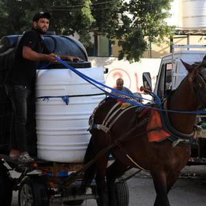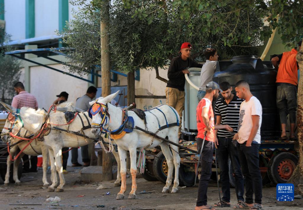 10月30日,因缺乏燃料,人們在加沙地帶南部城市汗尤尼斯使用畜力車運輸飲用水。