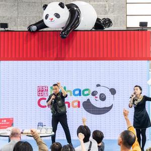 10月28日,游客在日本大阪國際會展中心中國館體驗為熊貓玩偶上色。