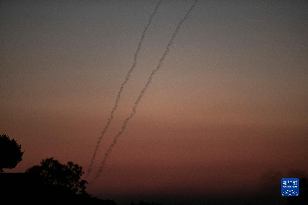 這張10月30日在加沙邊境以色列一側拍攝的照片顯示,從加沙地帶發射的火箭彈在空中留下煙軌。