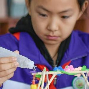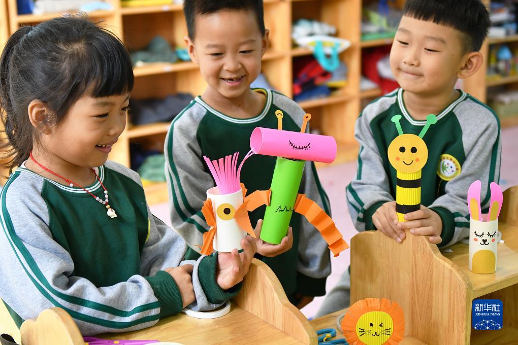 10月31日,山東省煙臺市福山區未來之星幼兒園的小朋友利用廢舊物品制作手工藝品。