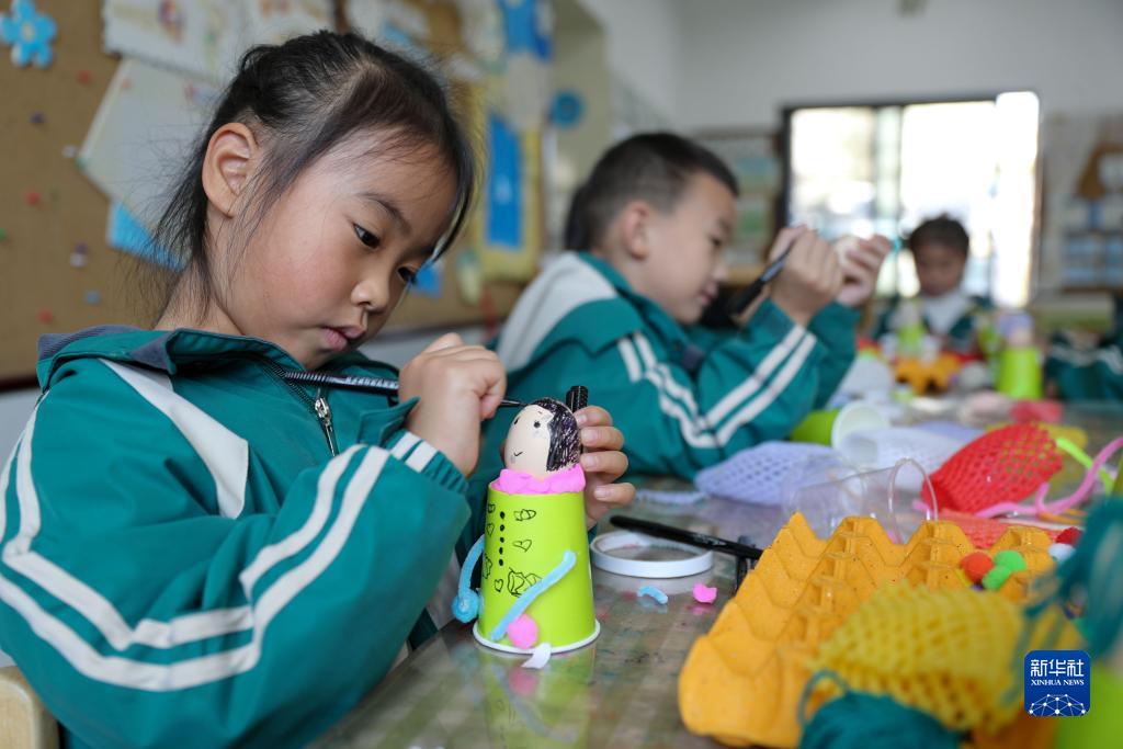 10月31日,貴州省開陽縣第二幼兒園的孩子用廢棄雞蛋殼和紙杯制作手工藝品。