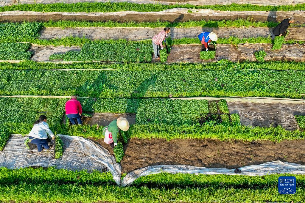 10月31日,在江西省瑞昌市范鎮良田村,龍鑫農機專業合作社員工在農田里移栽油菜秧苗(無人機照片)。