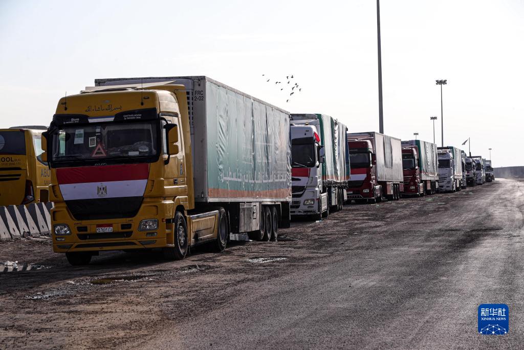數百輛載有救援物資的卡車在拉法口岸埃及一側等待進入加沙。