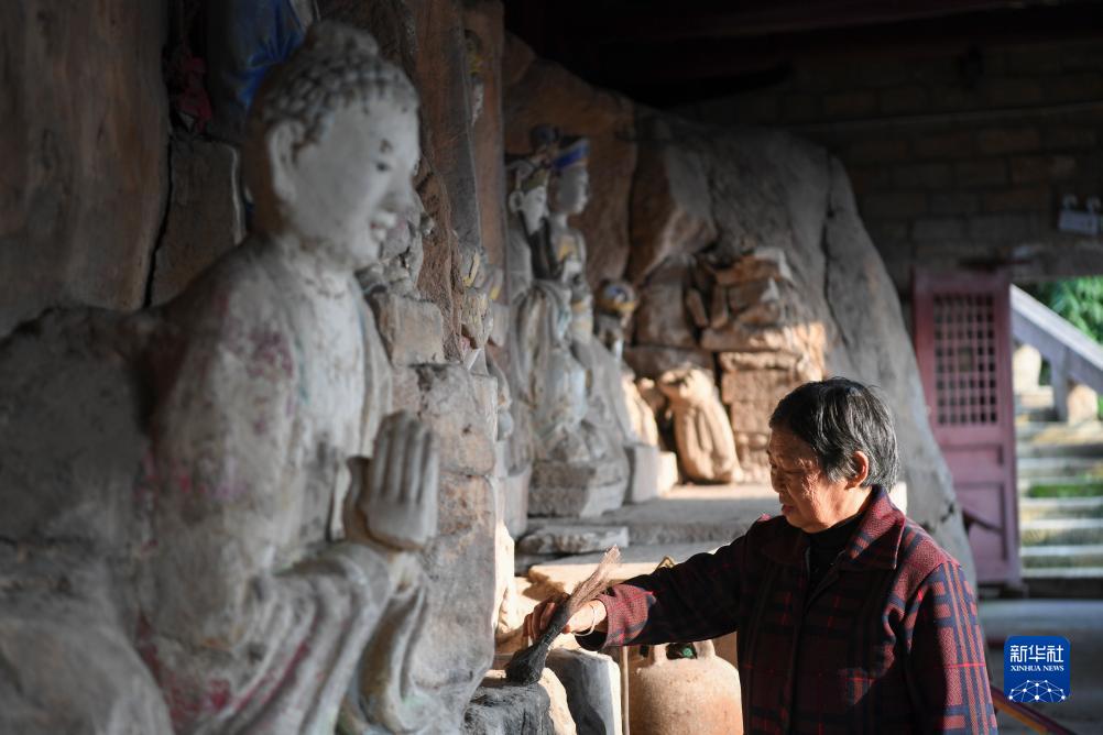 10月31日,在重慶市大足區中敖鎮金盆村,義務文保員在普圣廟摩崖造像文物保護點打掃衛生。