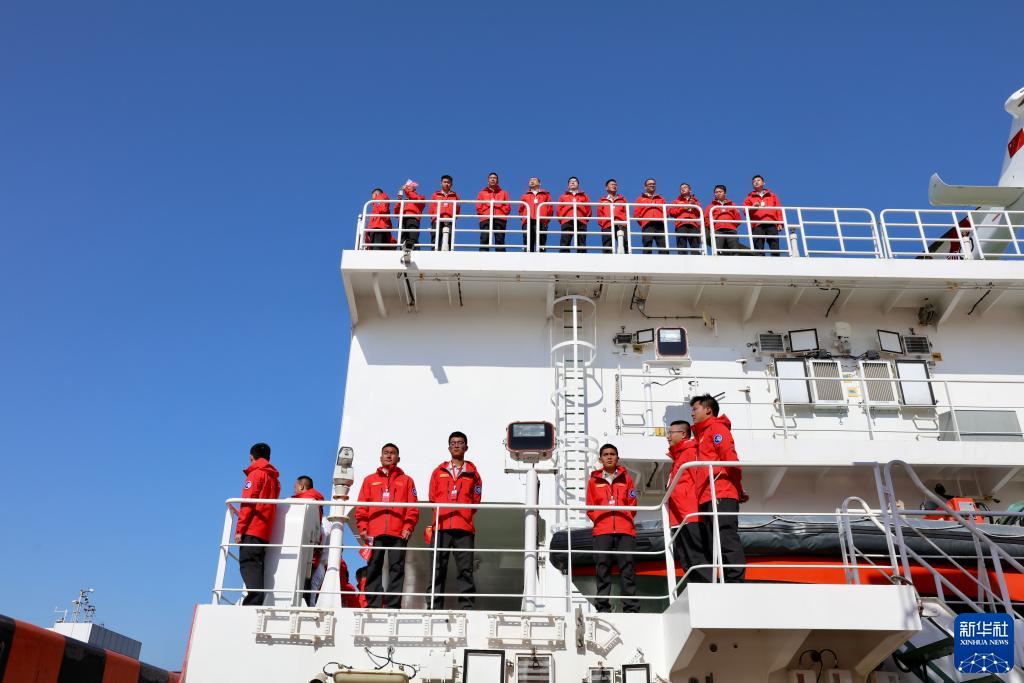 11月1日,在“雪龍2”號極地科學考察破冰船上,科考隊員在起航前列隊向送行人員告別。