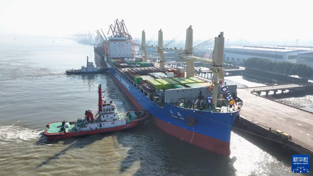 11月1日,“天惠”輪貨船準備駛離張家港港(無人機照片)。