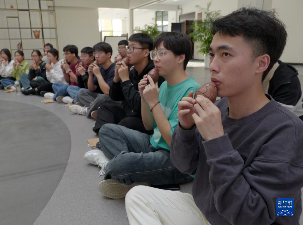 10月31日,在河南省武陟縣黃河交通學院黃河文化館內,學生在練習吹奏黃河泥塤。