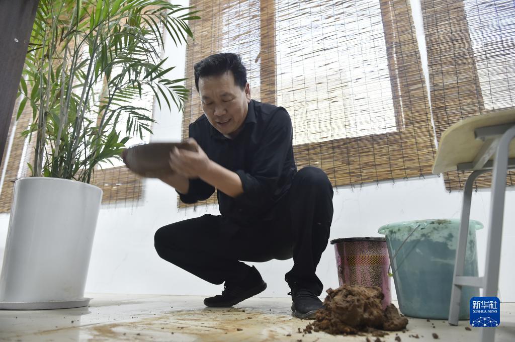10月31日,王建在河南省武陟縣黃河交通學院工作室里和泥,準備制作黃河泥塤。