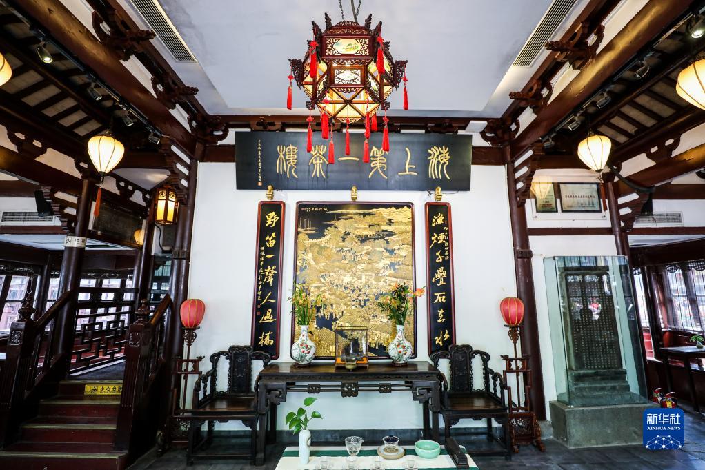 這是10月12日在上海豫園拍攝的湖心亭茶樓內景。湖心亭茶樓是上?,F存最古老的茶樓。
