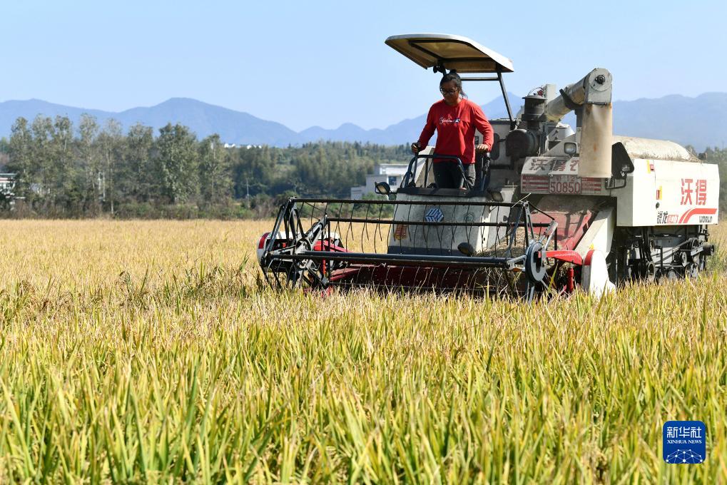 11月1日,在湖北省咸寧市通城縣四莊鄉向家村,種糧大戶駕駛收割機在田間收割晚稻。