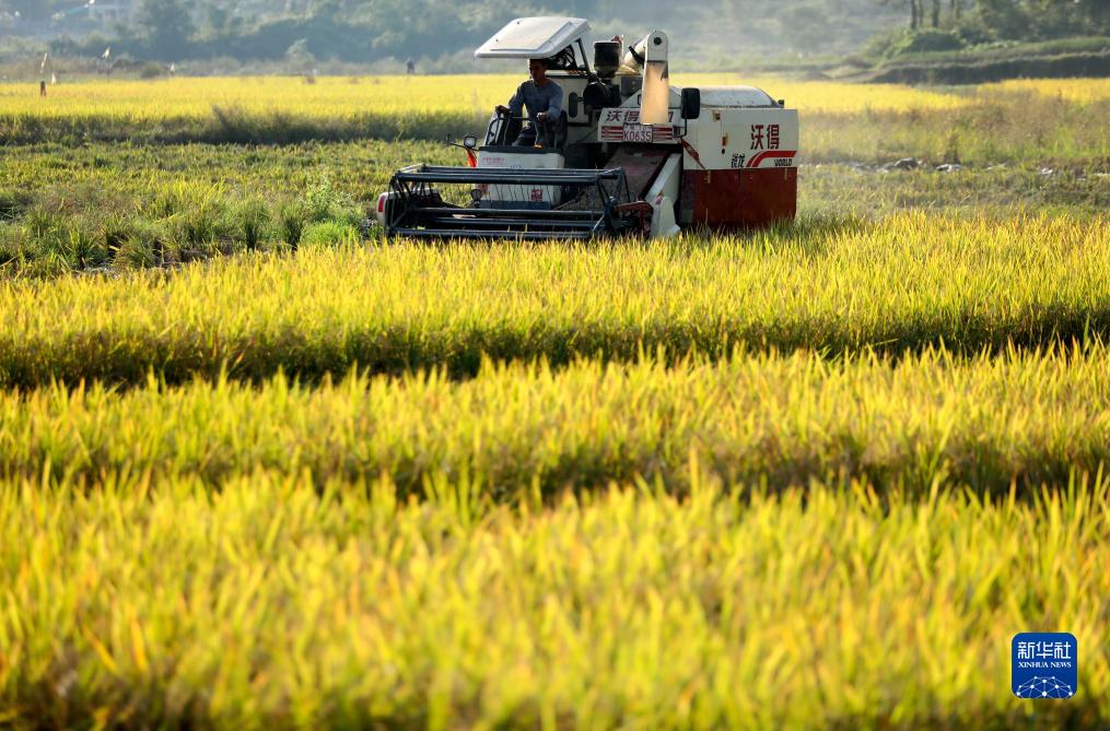 10月31日,在湖南省資興市唐洞街道鹿橋村,農民駕駛收割機收獲晚稻。
