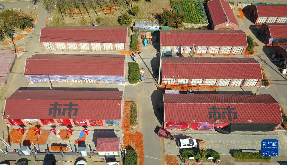 11月1日,在山東省濰坊市臨朐縣五井鎮,村民在晾曬柿子(無人機照片)。