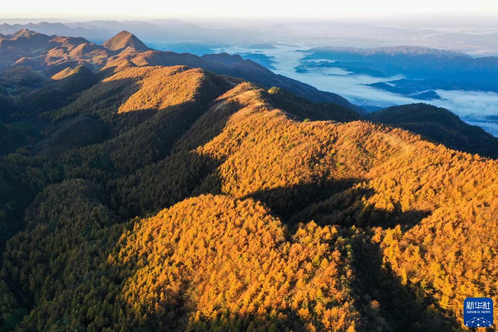 11月1日拍攝的湖南省湘西土家族苗族自治州龍山縣大安鄉萬寶山林場秋色(無人機照片)。