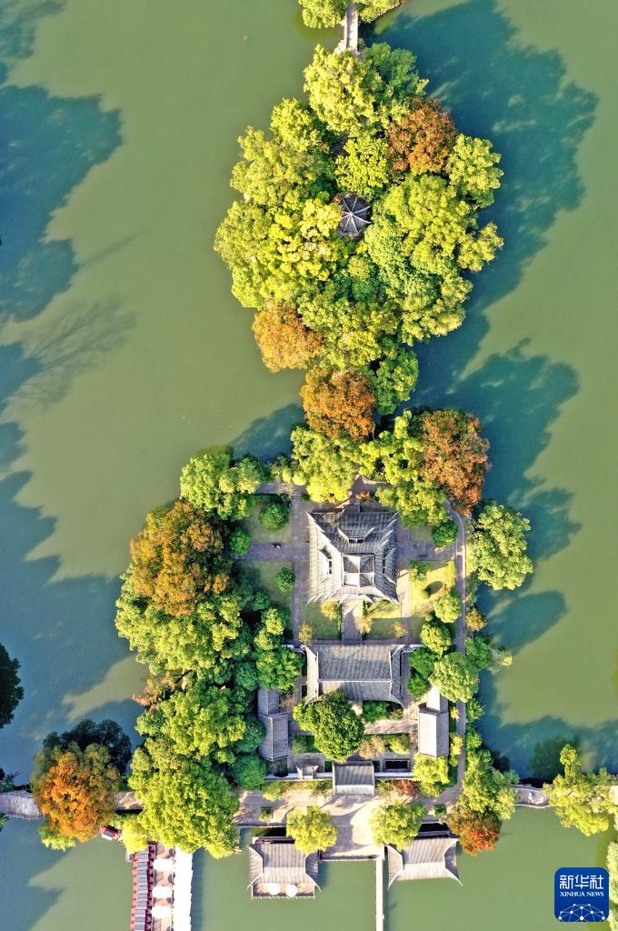 10月30日在浙江省臨海市東湖公園拍攝的秋景(無人機照片)。