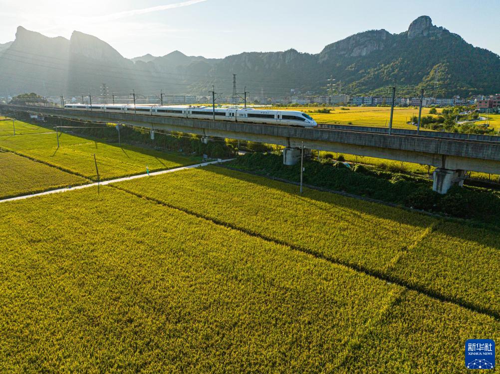 11月1日,在浙江省溫嶺市大溪鎮佛隴村,一列動車組列車駛過(無人機照片)。
