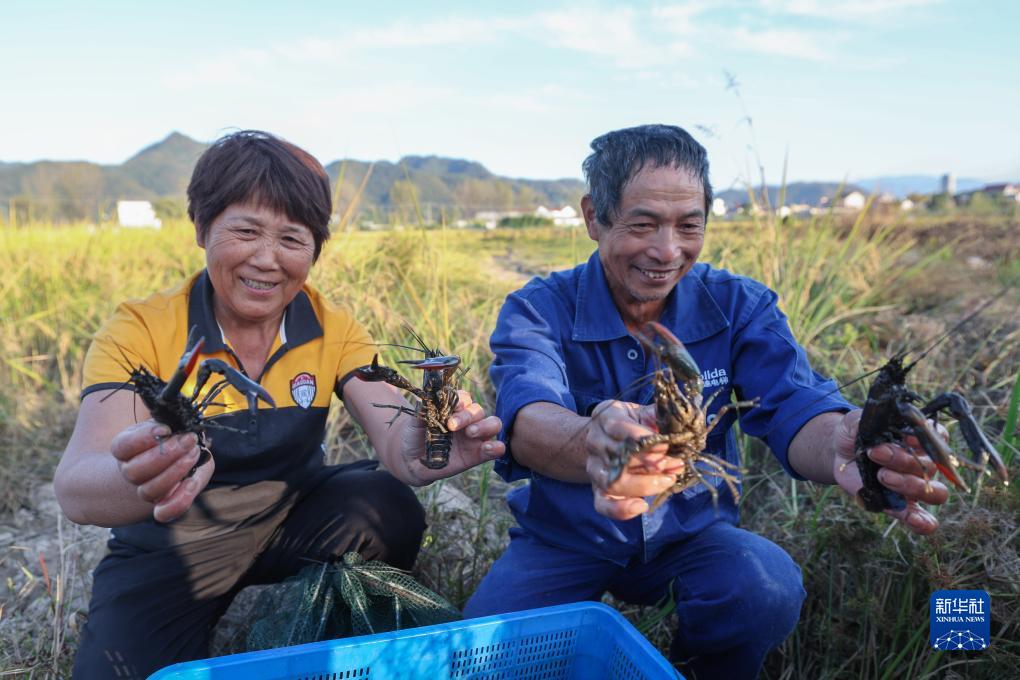 11月1日,建德市大洋鎮三河村的澳洲淡水龍蝦養殖戶展示剛剛捕撈的龍蝦。