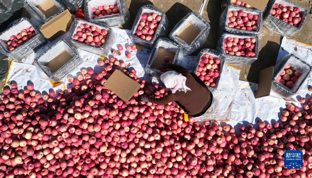 10月31日,果農在甘肅省永靖縣峴塬鎮劉家村蘋果基地分揀包裝蘋果(無人機照片)。