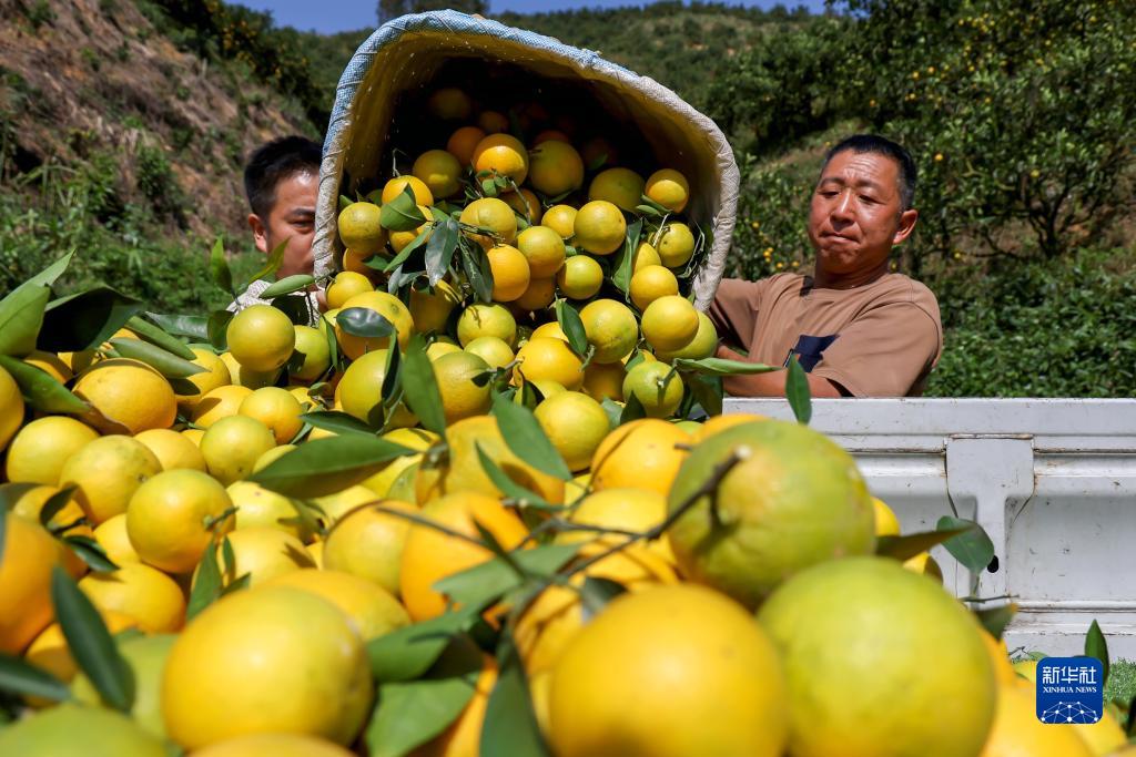 11月1日,村民在貴州省羅甸縣龍坪鎮頂訪村臍橙種植基地將臍橙裝車。