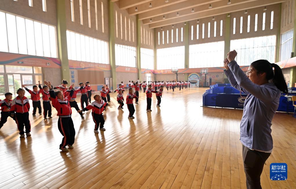 11月1日,在天津市西青區梅江富力小學,體育老師帶著學生在室內進行體育鍛煉。