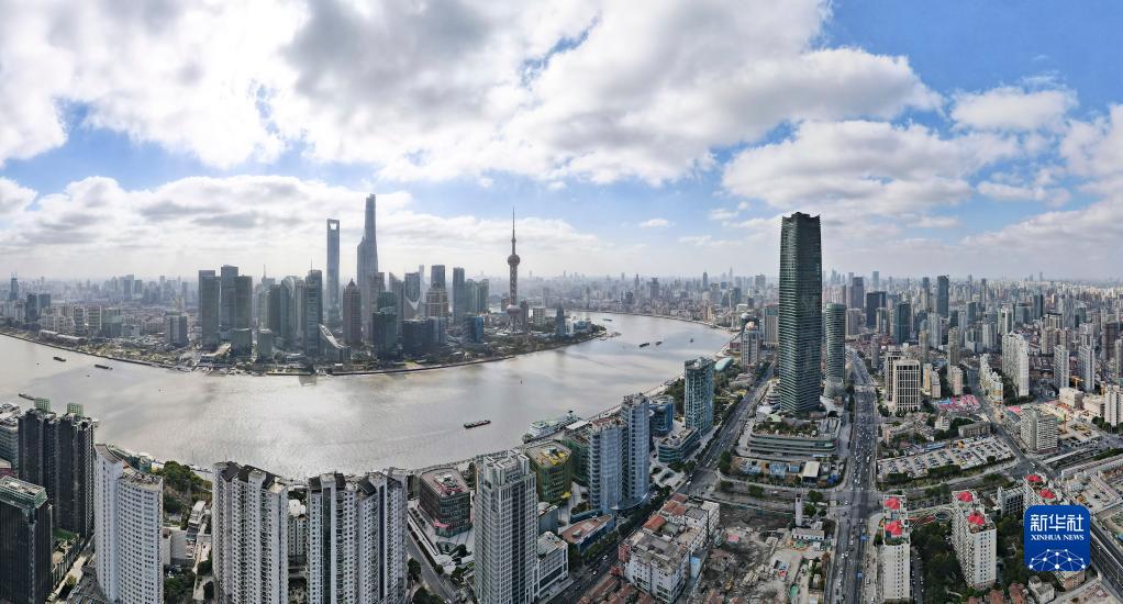 從上海虹口區北外灘空中俯瞰黃浦江兩岸(1月10日攝,無人機全景照片)。