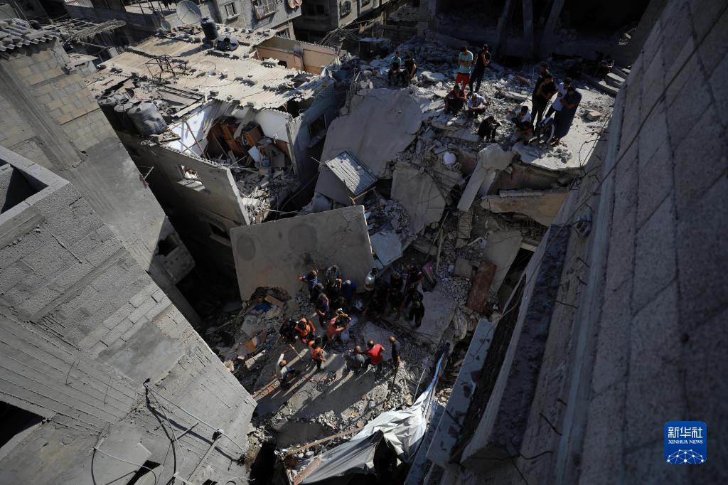 11月1日,在加沙地帶南部城市汗尤尼斯,人們在遭以色列襲擊后的建筑廢墟進行搜救工作。
