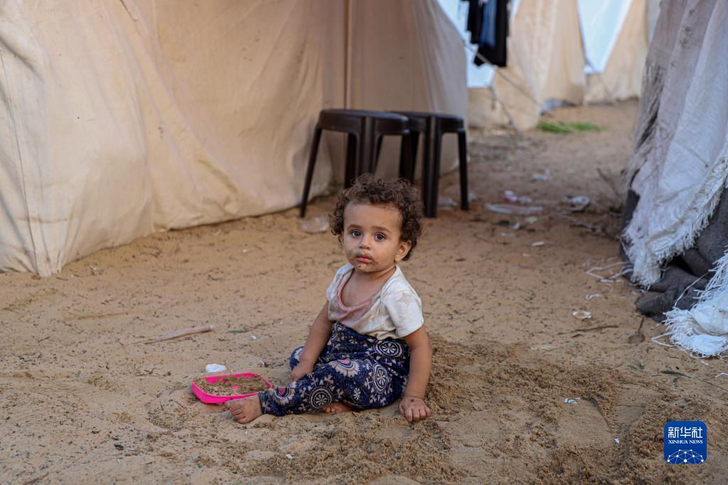這是11月1日在加沙地帶南部城市汗尤尼斯一處臨時難民營地拍攝的流離失所的兒童。