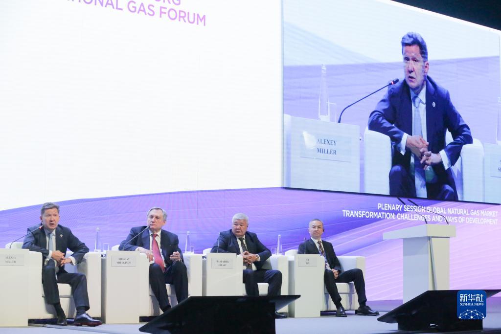 11月1日,在俄羅斯圣彼得堡舉行的第十二屆圣彼得堡國際天然氣論壇全體會議上,俄羅斯天然氣工業股份公司總裁阿列克謝·米勒(左一)發言。