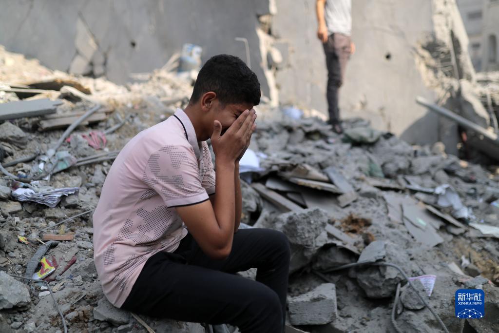 11月2日,在加沙地帶中部的布賴杰難民營,一名男子坐在以軍空襲后的建筑廢墟上哭泣。新華社發(亞西爾·庫迪 攝)