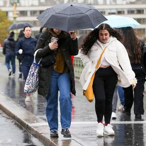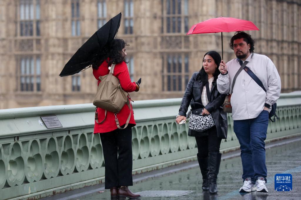 11月2日,在英國倫敦,人們打著傘走在威斯敏斯特橋上。