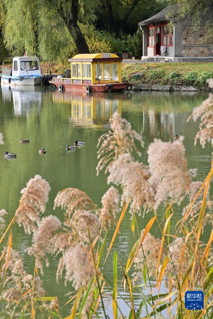 11月3日,在北京頤和園,水鳥在蘆葦邊戲水。