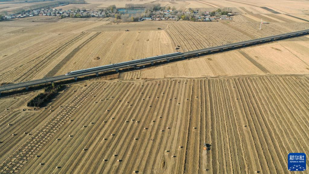 10月30日,在吉林省德惠市米沙子鎮鐵嶺村,農民駕駛農機打包秸稈(無人機照片)。