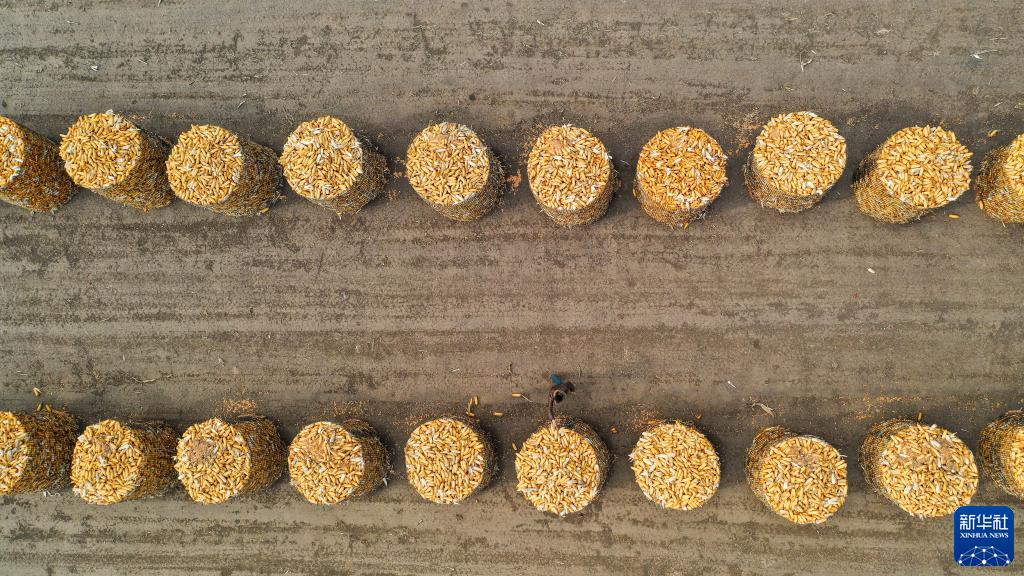 11月2日,在吉林省四平市梨樹縣喇嘛甸鎮,農民檢查科學儲糧倉儲存情況(無人機照片)。