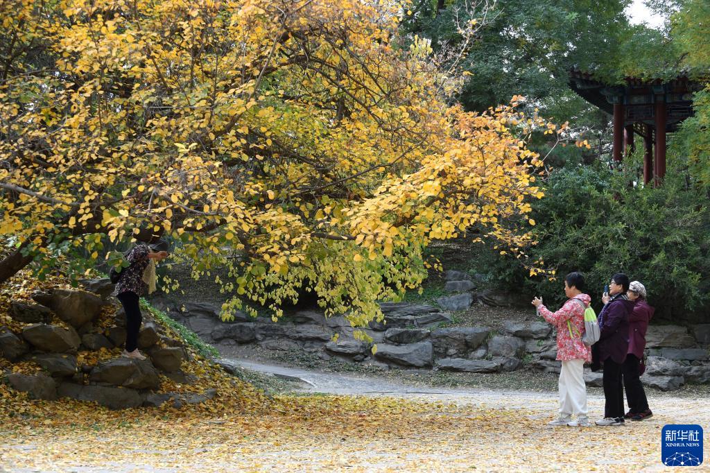 深秋時節,北京圓明園內層林盡染,園內種植的銀杏、白蠟樹、楓樹、槭樹、黃櫨等彩葉觀賞樹種,色彩斑斕,形成多個彩葉觀賞區,吸引眾多游客駐足觀賞、留影。