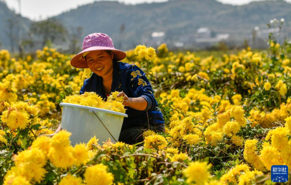 11月2日,村民在貴州省黔南布依族苗族自治州福泉市龍昌鎮楓香樹村采收金絲皇菊。