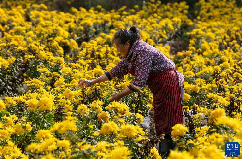 10月29日,村民在重慶市南川區黎香湖鎮東湖村中藥材基地里采摘金絲皇菊。