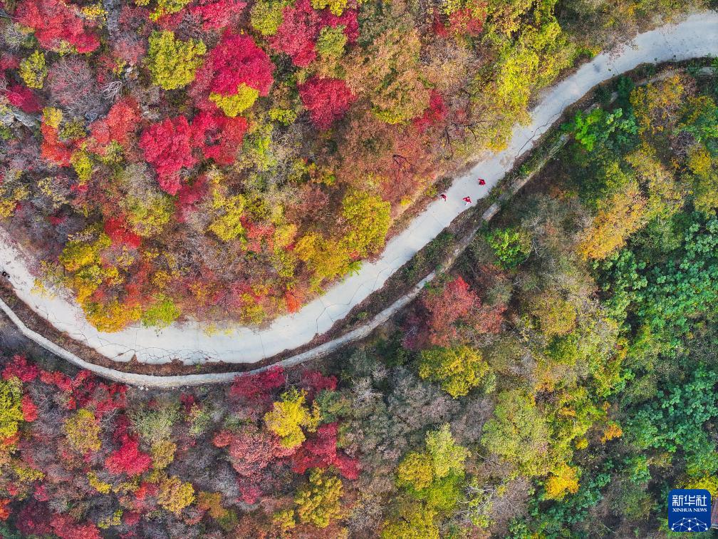10月29日,游客在山東省淄博市博山區紅葉柿巖景區游覽(無人機照片)。
