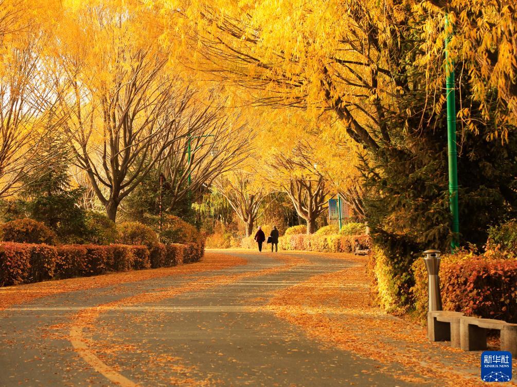 11月2日,市民行走在甘肅張掖國家濕地公園南口景觀大道上。