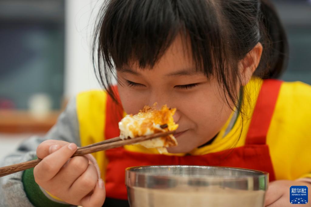 10月30日,在重慶市特殊教育中心的勞動課教室內,一名三年級的視力障礙學生夾起自己煎好的雞蛋。