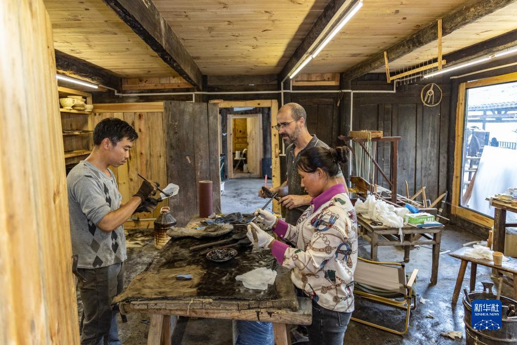 在重慶市城口縣北屏鄉松柏村,文森(中)在工作室內指導徒弟鄭永平(左)、和求花對藝術作品進行前期的裱布工作(5月29日攝)。