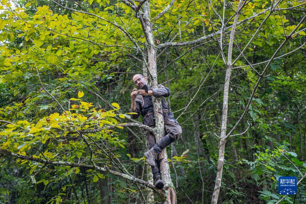 9月15日,在重慶市城口縣北屏鄉松柏村,文森在深山中的一棵漆樹上將漆繭折成勺形,準備安放。