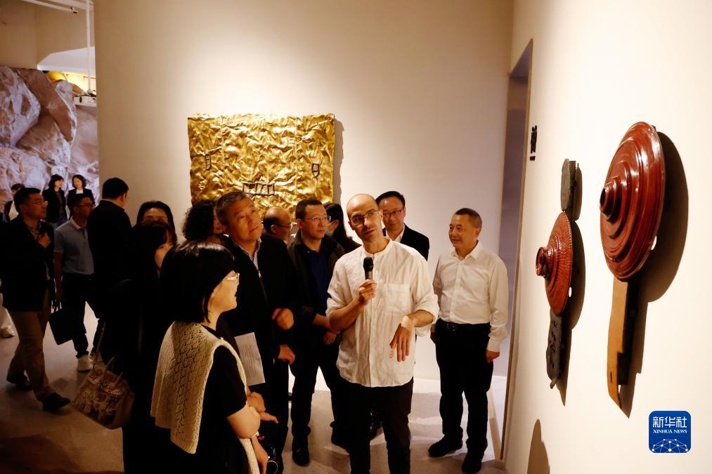 在重慶悅來美術館·巖石空間舉辦的“重慶藝術家檔案——文森·漆”主題展覽上,文森(前右)向觀眾介紹作品(4月27日攝)。