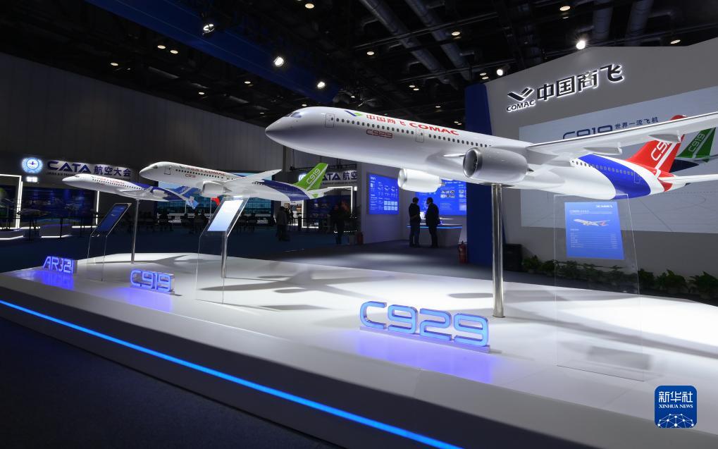 11月3日在中國商用飛機有限責任公司展臺拍攝的國產C929(右)、C919(中)等飛機模型。