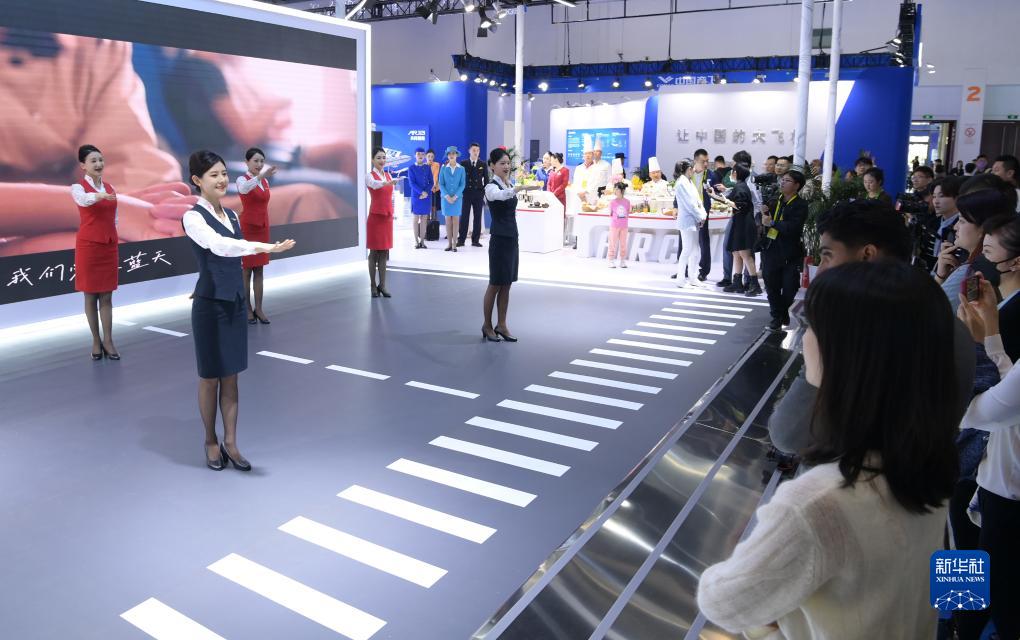 11月3日,來自中國國際航空公司的空乘人員在展臺進行手語表演。