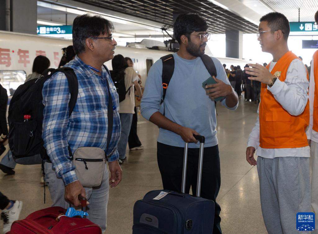 11月3日,進博志愿者為抵達上海虹橋火車站的外國旅客指引方向。