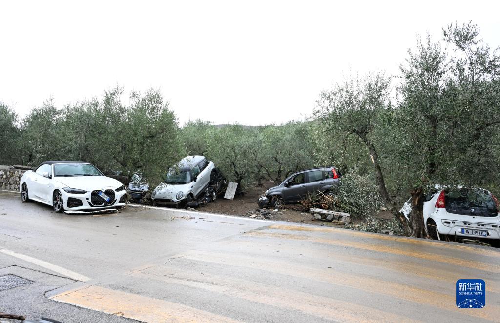 11月3日,在意大利托斯卡納大區比森齊奧營,車輛遭風暴毀壞。新華社發