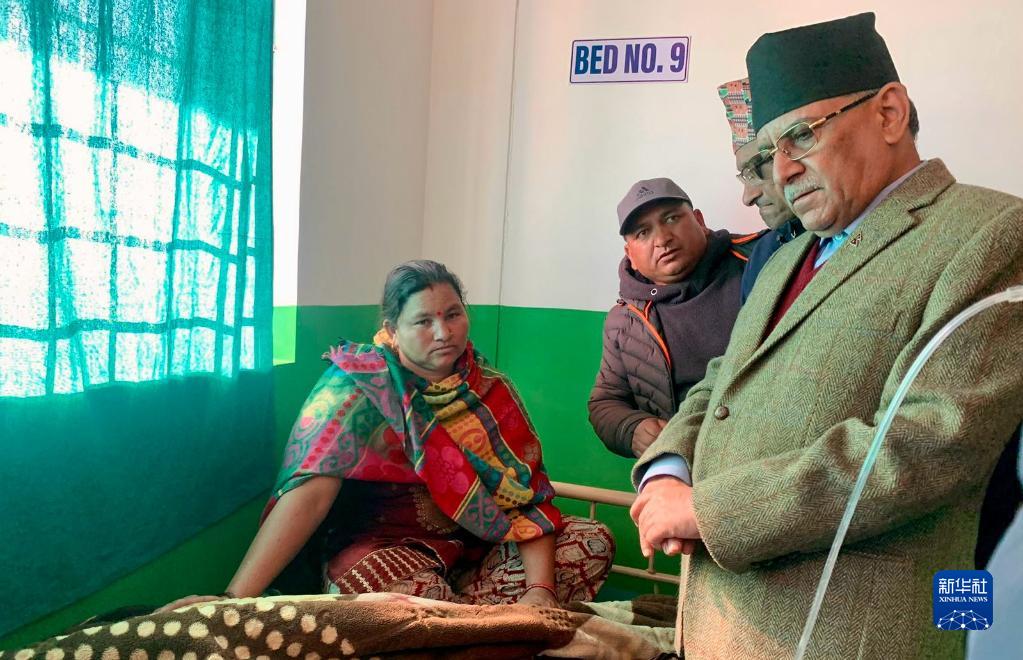 11月4日,在尼泊爾西部扎澤爾果德,尼泊爾總理普拉昌達(右)在醫院看望受傷民眾。