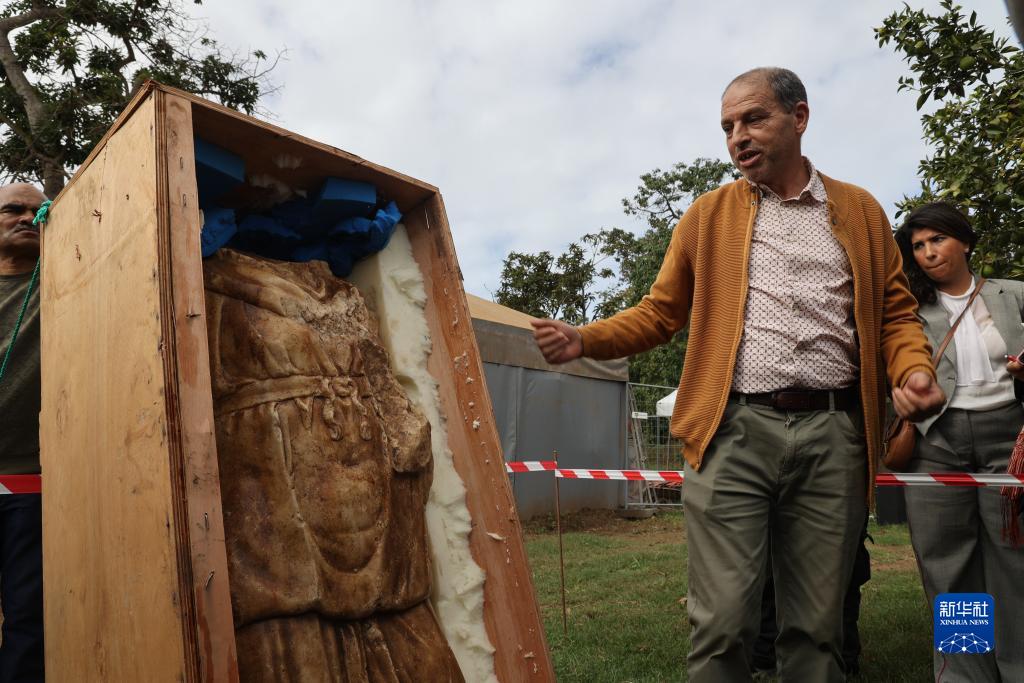 11月3日,在摩洛哥首都拉巴特,考古工作者介紹在古城遺址出土的一尊大理石雕塑。