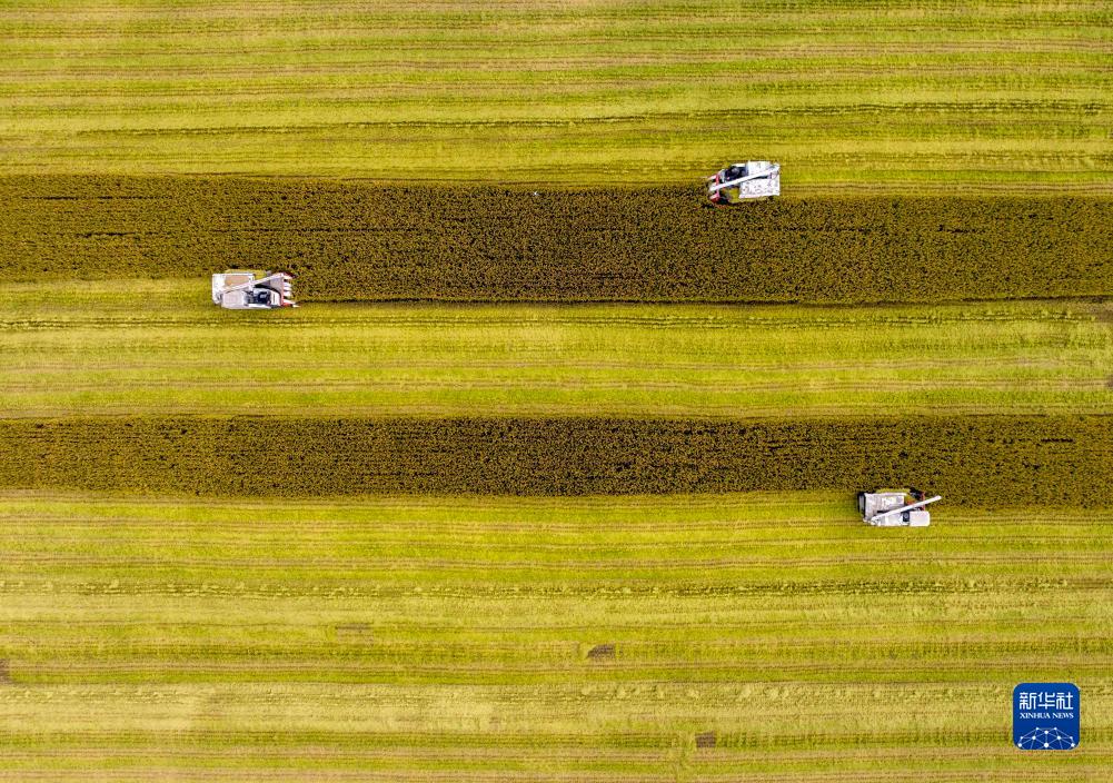 11月4日,農民駕駛農機在江蘇省泰州市姜堰區顧高鎮翟莊村田間收割水稻(無人機照片)。