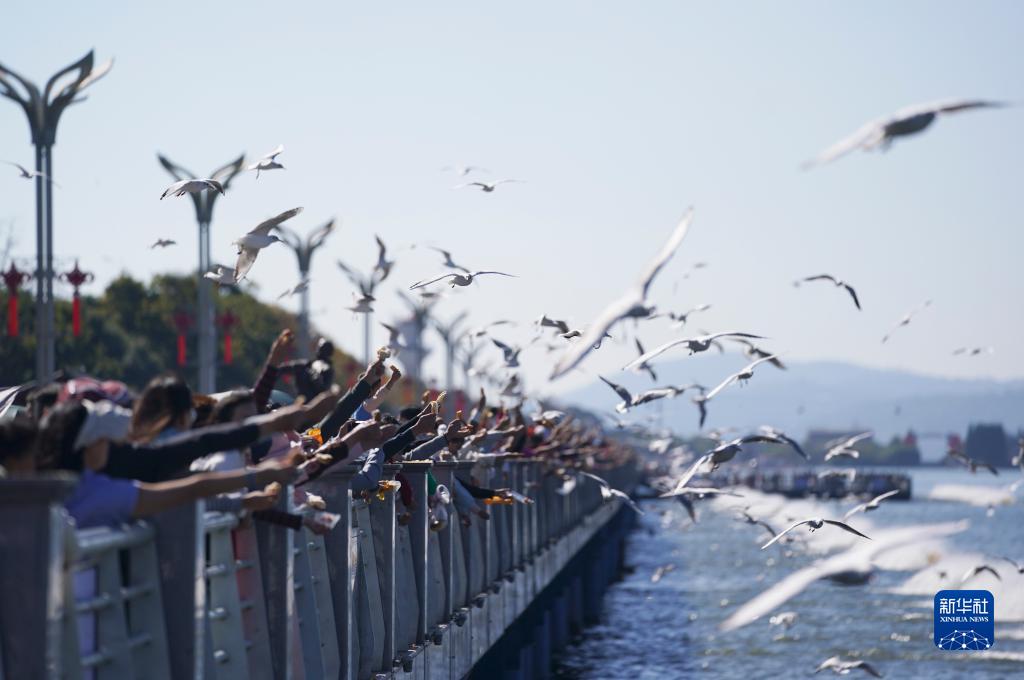 11月4日,游客在昆明滇池海埂觀景大道觀賞紅嘴鷗。
